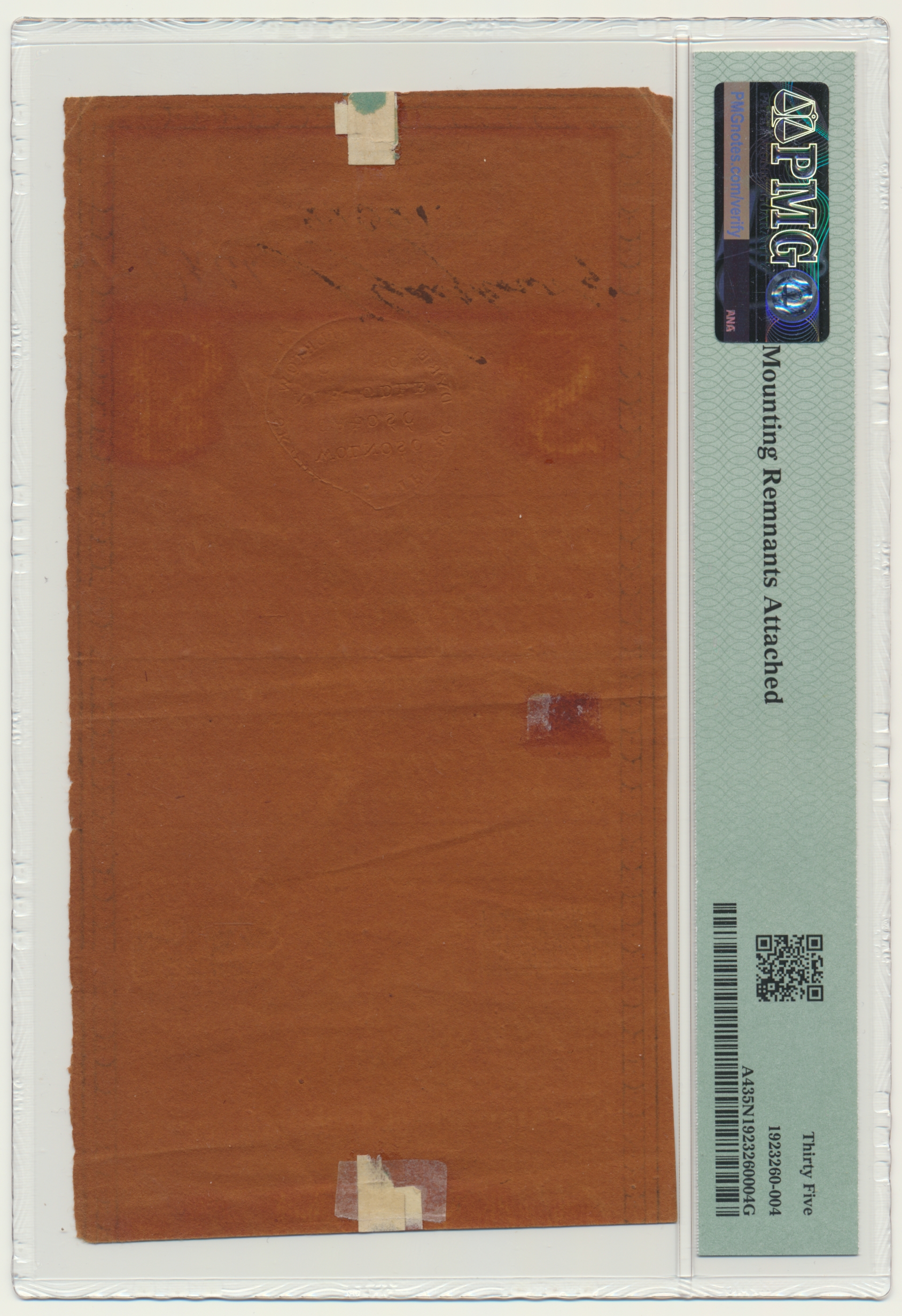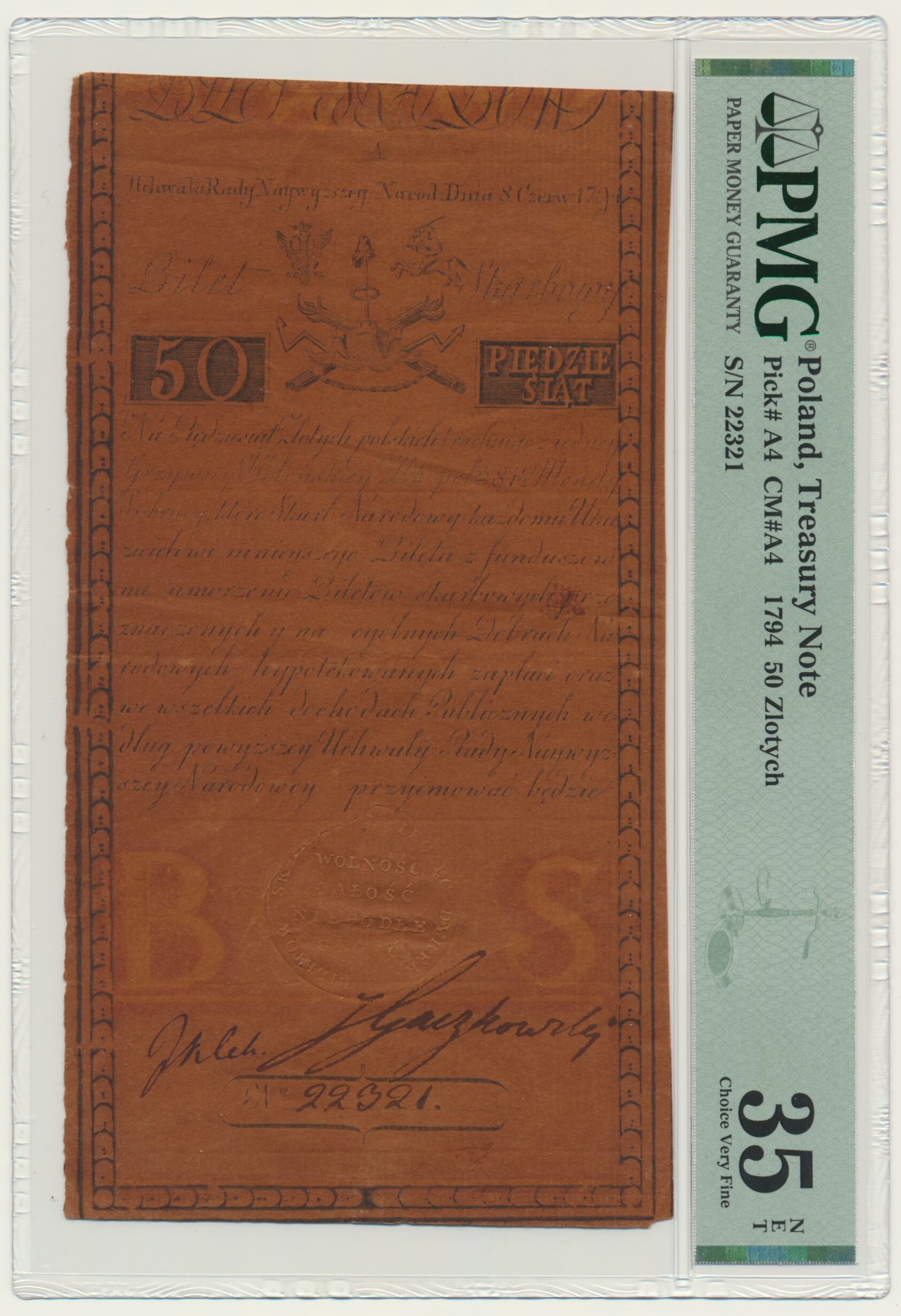 Banknot w slabie PMG z oceną PMG 35 NET.